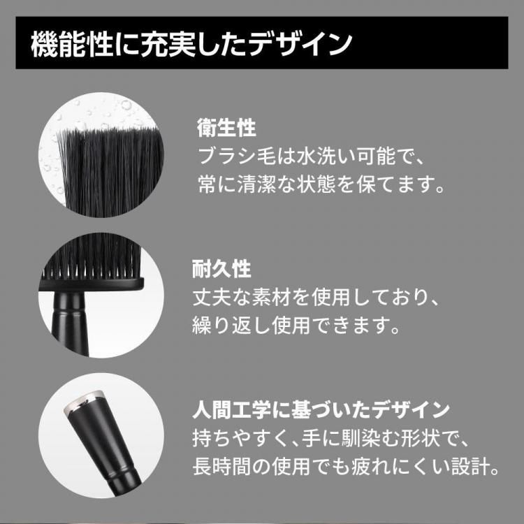 理髪店やバーバーショップで使用される、カット後の首周りに付着した髪の毛を払い落とすためブラシ。肌触り良く、効率的で快適。丈夫で清潔に使えるブラシ。