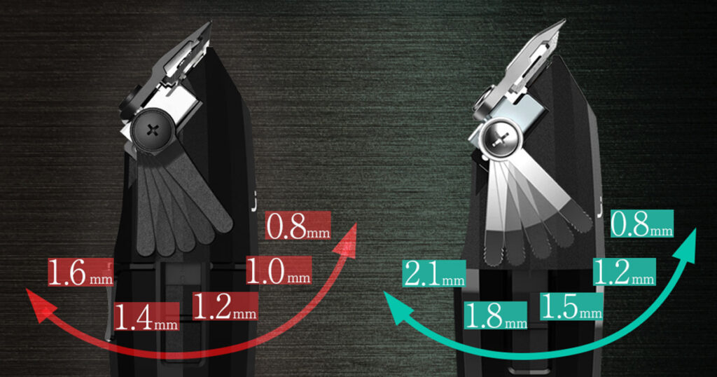 0.8㎜の状態で装着すると、表記された㎜数でカット可能 - 上刃と下刃の先端を手動で調整することで、デフォルトの刈高よりもさらに薄くすることが可能(ゼロギャップシステム)